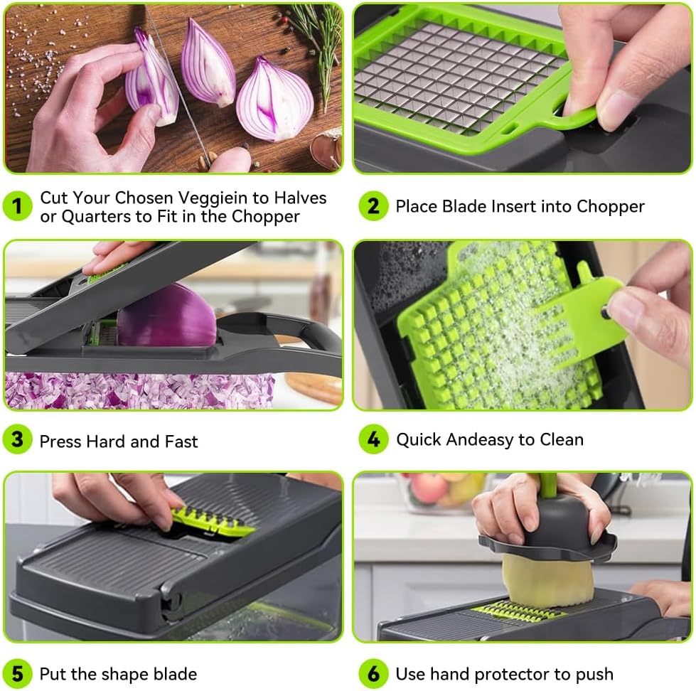Направете приготвянето на храната по-бързо, лесно и безопасно с този 16-в-1 ръчен уред за рязане – перфектният кухненски помощник за рязане, кълцане, настъргване и спирализиране на плодове и зеленчуци.
